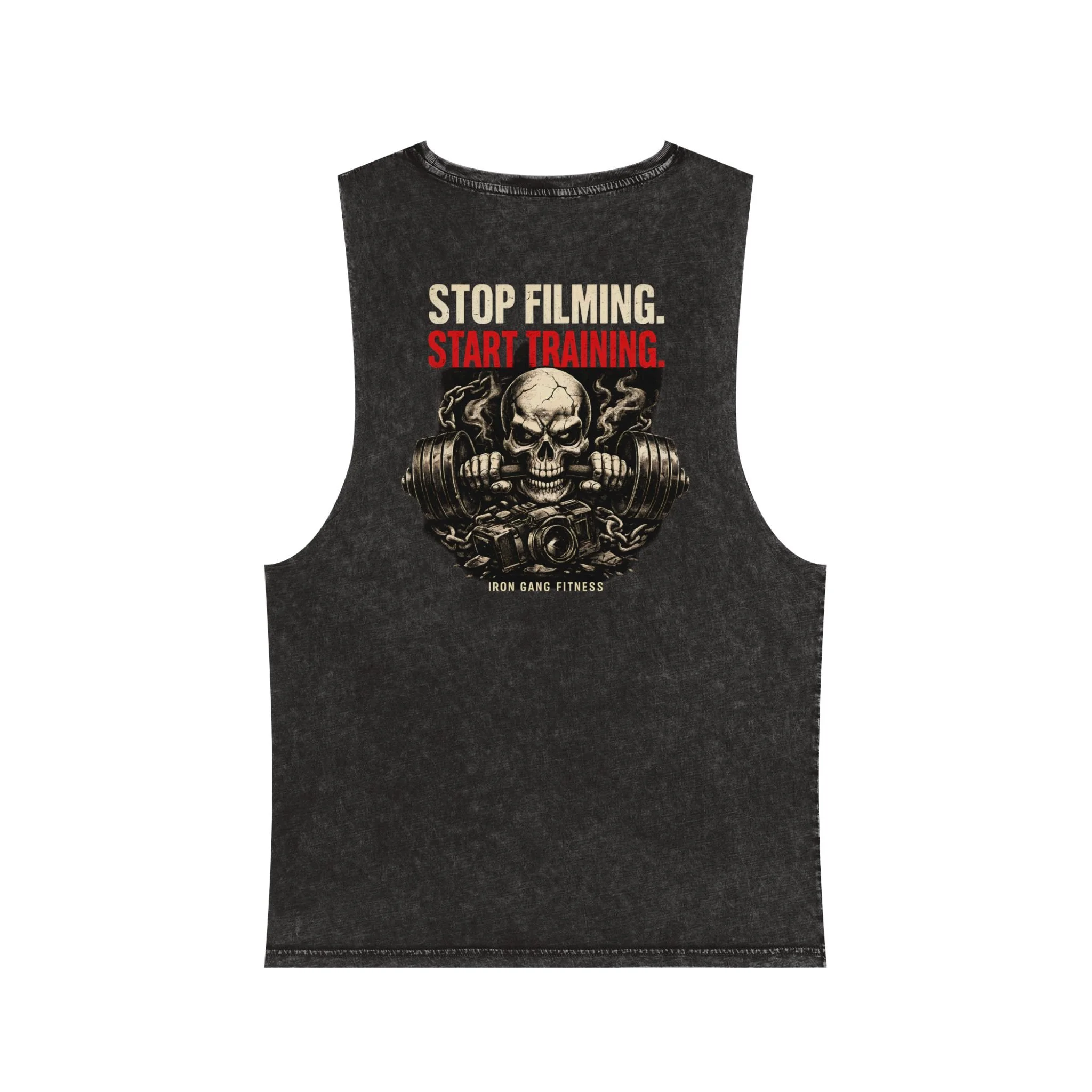A lived-in, garage-gym tank made for people who show up and lift. The soft stonewash cotton settles into the shoulders and chest so the graphic feels like it’s always been part of your workout. Cut-off sleeves and a relaxed cut let your shoulders move free during presses, pulls, and heavy singles. The front chest patch is low-key and the back shouts a no-nonsense message: Stop filming. Start training. Wear it between lifts, on rest days, or when you need a reminder to focus on the bar and the work.